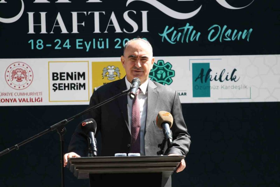 Ahilik kültürünün Anadolu medeniyetinin taşınmasında önemli bir mecra olduğunu ifade eden Konya Valisi Vahdettin Özkan, "Esas olan, toplumun hem kültürel değerlerin inşası hem gelecek kuşaklara intikal etmesindeki en önemli mecra maişet temini bir yandan yapılırken, bir yandan da esnaflık kültürü bir sosyal yardımlaşma ve dayanışma fonksiyonunu da ifa edegelmiştir. Bugün de bunun güçlenerek devam etmesi, güçlü toplum, güçlü şehir inşa etmenin en önemli hususlarından birisidir. Alın teri dökerek insanlarımıza hem kendi maişetini hem topluma hizmet sunan değerli esnaf kardeşlerimizi canı gönülden tebrik ediyorum. Haftanız mübarek olsun. İnşallah dünyadaki rekabet gücümüzü artıracak kalkınmanın en temel unsurlarından olan sosyal kalkınma, kültürel kalkınmanın da öncü misyonunu artırarak devam ettiririz. Bu esasen toplumumuzun küresel olarak maruz kaldığı, kalacağı riskleri bertaraf etmede de esnafımızın bu dayanışması bu manevi istiva noktaları bir güvence mekanizmasıdır" diye konuştu.