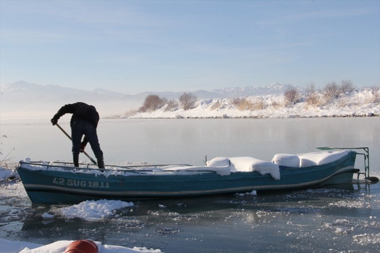 Konya'nın Yalıhüyük ilçesine kıyısı bulunan Suğla Gölü'nden geçimini sağlayan balıkçılar, ava çıkabilmek için göl yüzeyindeki 10 santimetreyi bulan buzların erimesini bekliyor.