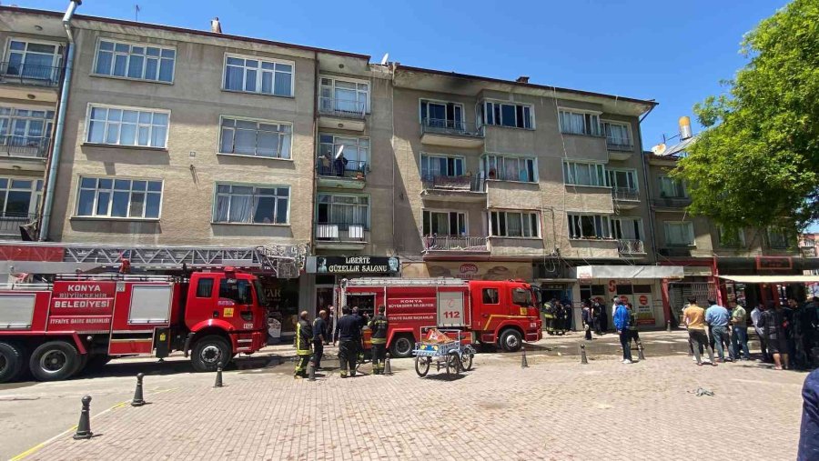 Konya'da Suriyeli ailenin yaşadığı evde çıkan yangında pencereden apartman boşluğuna atlayan kadın hayatını kaybederken, evde bulunan 4 kişi yaralandı.