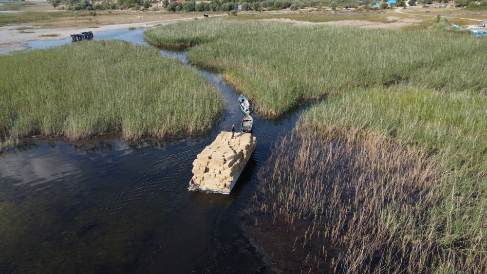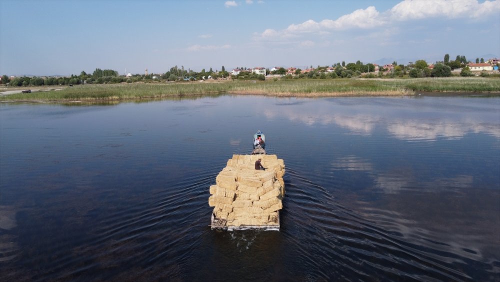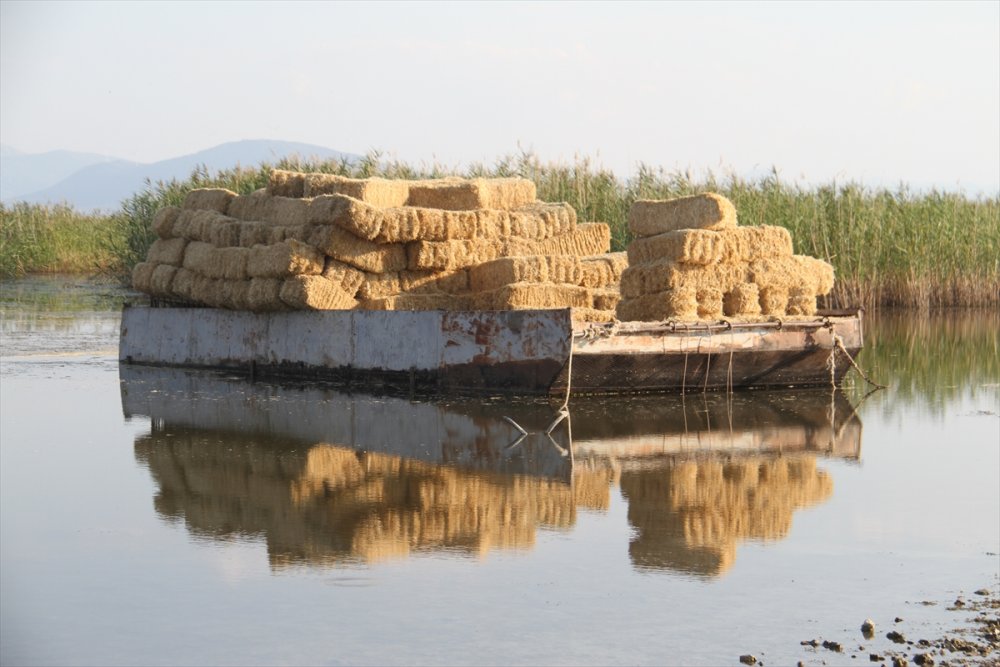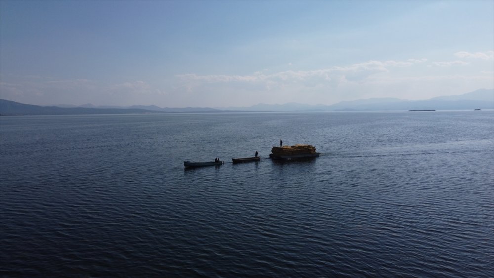 Konya'da Beyşehir Gölü üzerindeki bir adada hububat hasadının sonunda balya haline getirilen samanlar, "duba" adı verilen taşıma aracıyla gölde yüzdürülerek karşı kıyıya taşınıyor.