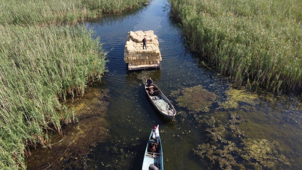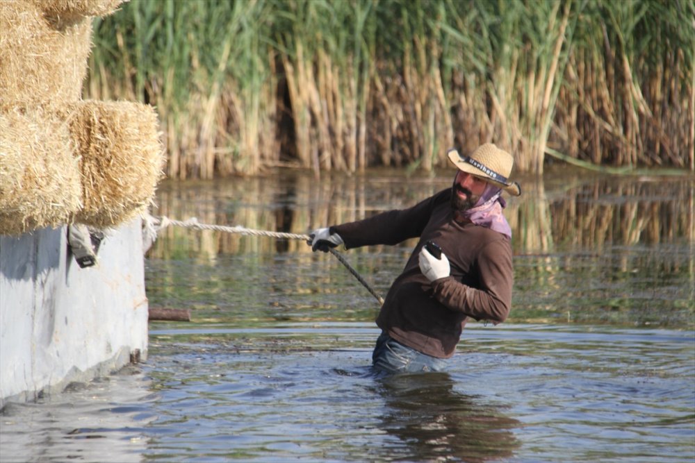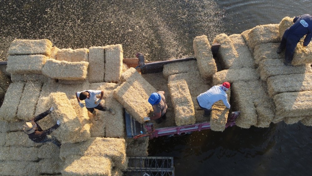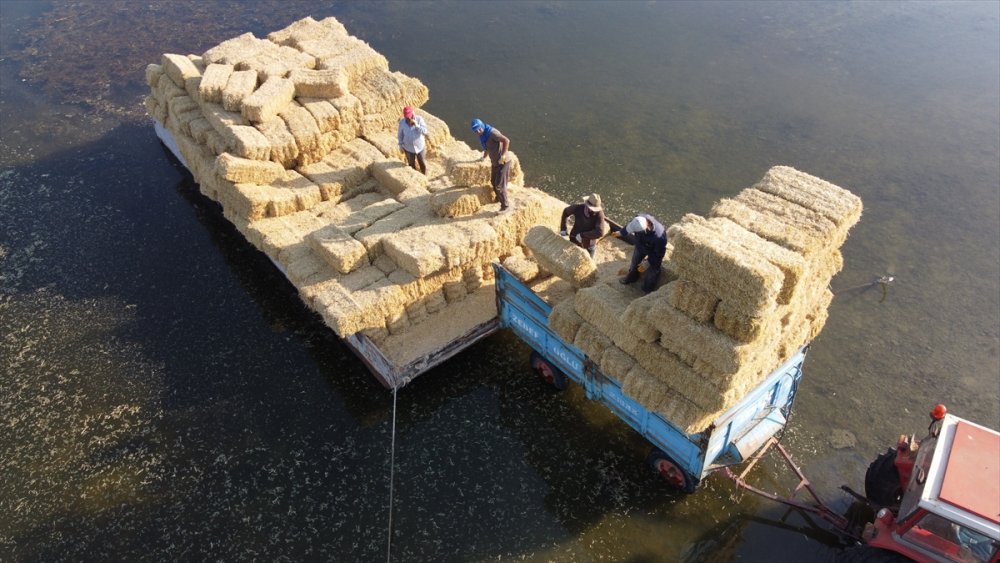 Bu sene de toplanıp duba üzerine konulan saman balyaları, motorlu balıkçı tekneleriyle çekilip yüzdürülerek kıyıya yanaştırılan traktör römorklarına yüklendi.