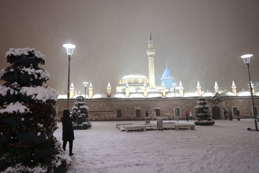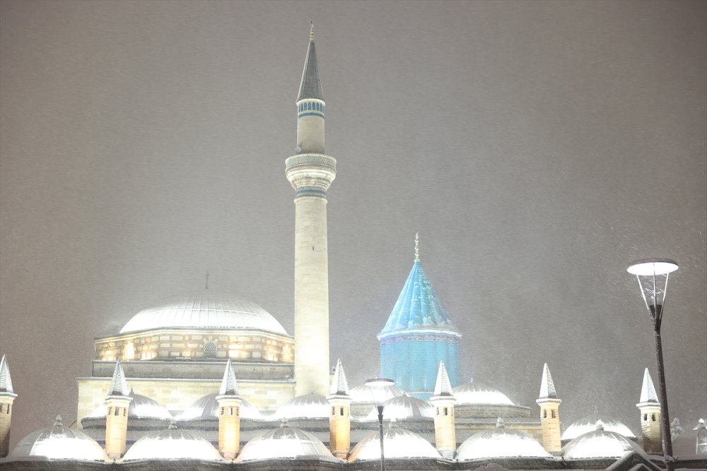 Mevlana'nın 748. Vuslat Yıl Dönümü Uluslararası Anma Törenleri için kente gelen yerli ve yabancı turistler, kar yağışıyla ayrı bir güzelliğe bürünen Mevlana Müzesi'ndeki Kubbe-i Hadra'nın fotoğraflarını çekti.