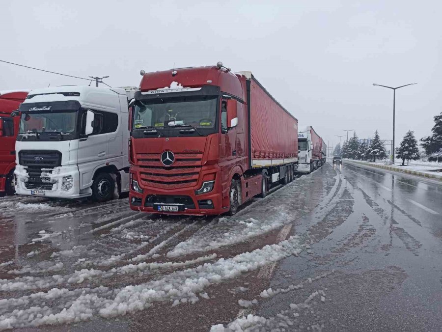 Tırı ile Nevşehir'den Antalya'ya briket götüren Hacı Yılmaz, "Nevşehir'den Antalya'ya briket götürüyordum, gidemiyoruz. Bekliyoruz şu anda polisler salmıyor. Mart karı böyle demek ki" dedi.