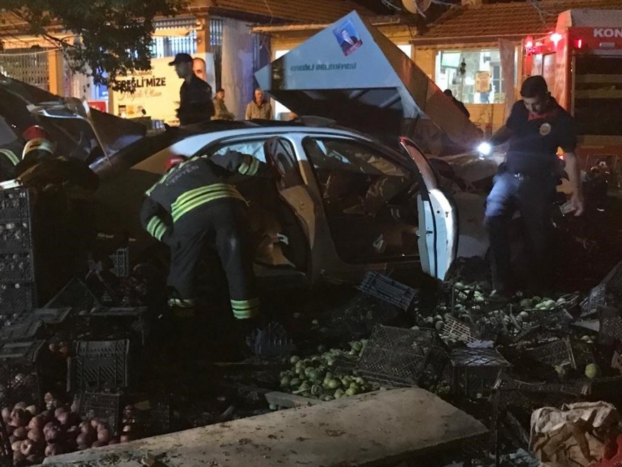Konya'nın Ereğli ilçesinde kontrolden çıkan otomobilin yol kenarında bulunan elma alım merkezi olarak kullanılan bir iş yerinin bahçesine uçması sonucu 4 kişi yaralandı.