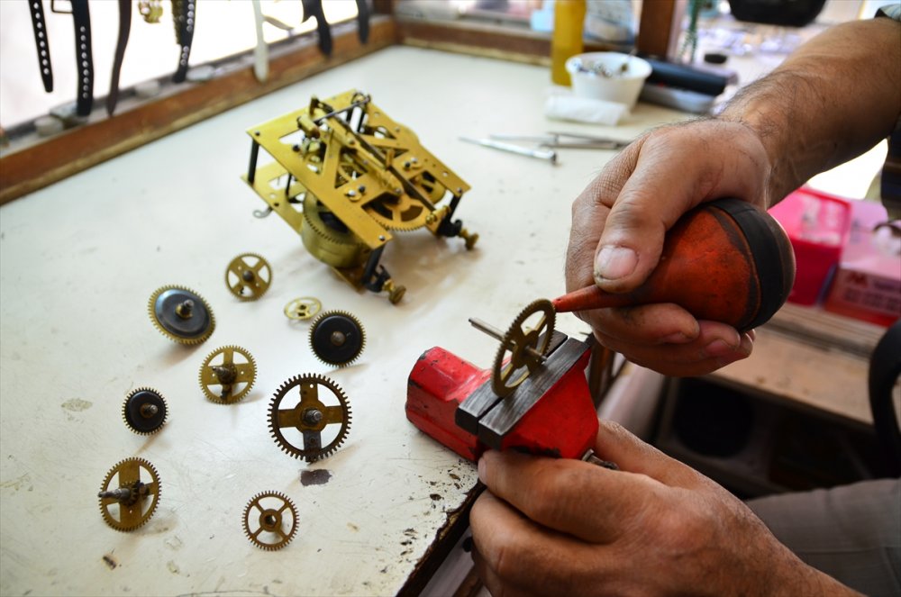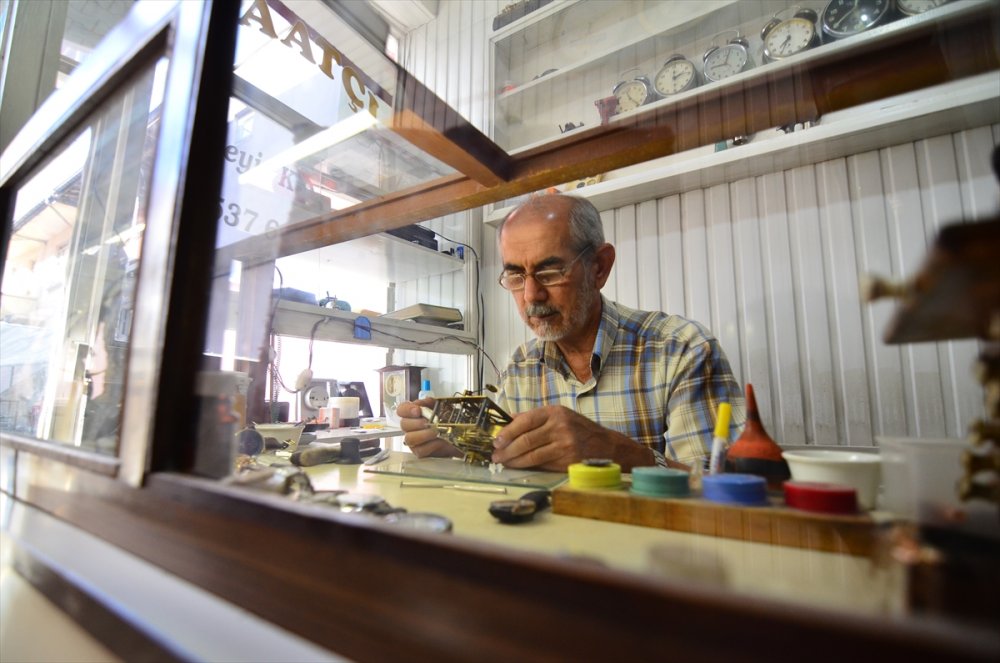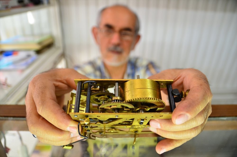 Konya'nın Sarayönü ilçesinde zemberekle çalışan mekanik sarkaçlı saatleri 51 yıldır tamir eden 69 yaşındaki Üzeyir Kulcabay, mesleğini ilk günkü aşkla sürdürüyor