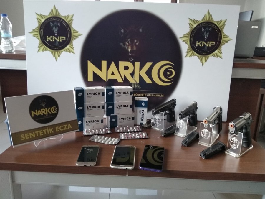 Şüphelilerden Z.A'nın evinde 350 uyuşturucu hap, R.Ş'nin evinde 13 uyuşturucu hap, 4 kuru sıkı tabanca ve tabanca ile 13 mermi ele geçirildi.