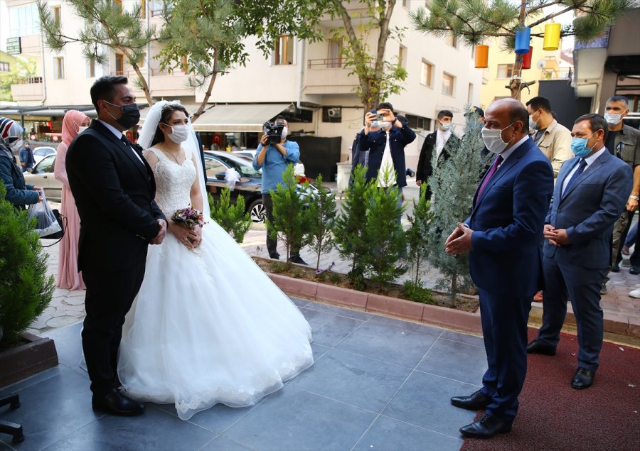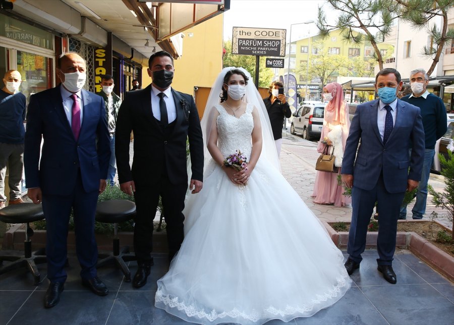 Ankara'nın Etimesgut ilçesindeki iş yerleri ve camilerde yeni tip koronavirüs (Kovid-19) tedbirleri kapsamında denetim yapan ekipler, maske takan gelin ve damatla hatıra fotoğrafı çektirdi.