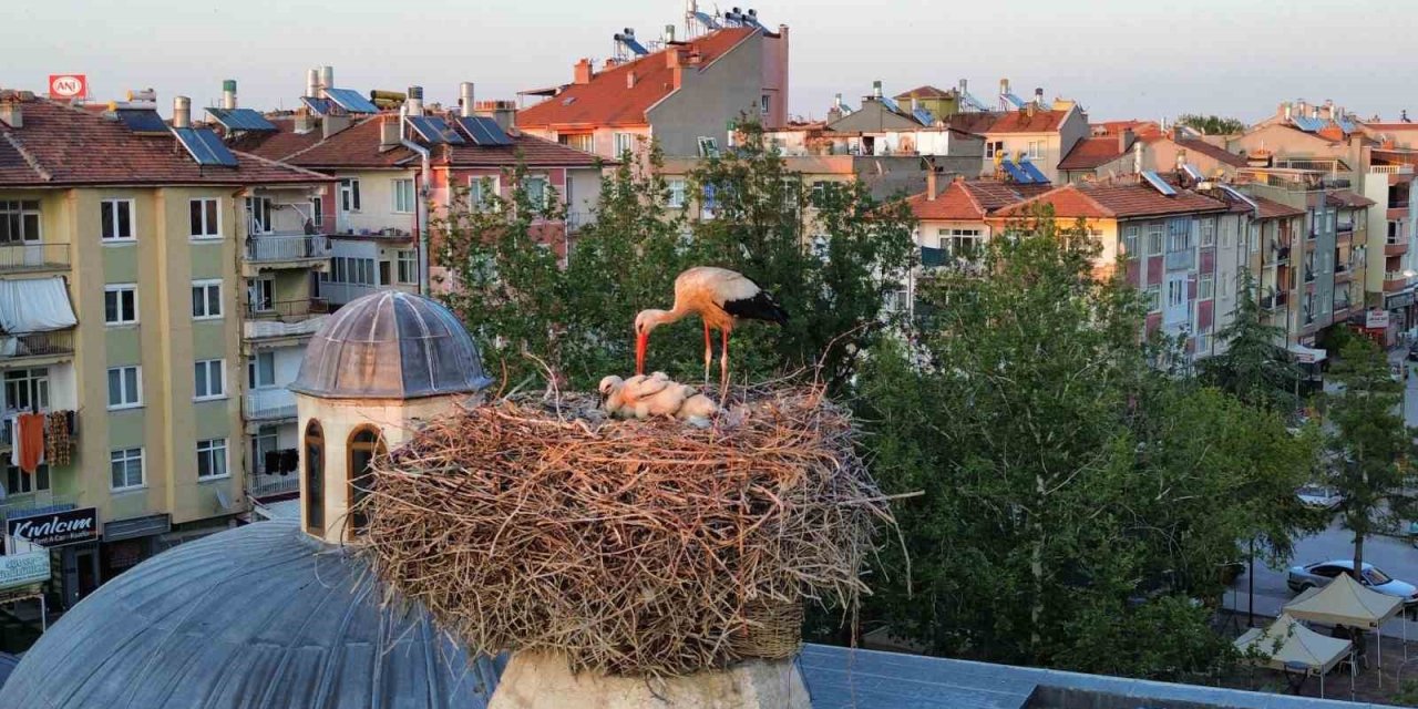 İmaret Mahallesi'ndeki tarihi İmaret Camisi'nin bitişiğindeki Karamanoğlu İbrahim Bey Kümbetindeki yuvalarında kalan leylekler 3 yavru dünyaya getirdi. Göç rotası üzerinde yaklaşık üç ay önce Karaman'a ulaşan leylekler, kümbet üzerindeki yuvalarına yerleşti. Burada konaklayan leyleklerin 3 yavrusu dünyaya geldi. Her yıl aynı dönemde yuvalarına gelen leylekler, cami cemaati ve vatandaşlarca ilgiyle takip ediliyor. Yuvadaki yavrularını besleyen leylek ise dronla havadan görüntülendi. Mahalleli leylek çiftinin her yıl mart ayının sonunda buraya geldiğini ve yavrularını büyüttükten sonra kış aylarına doğru göç ettiğini söyledi.