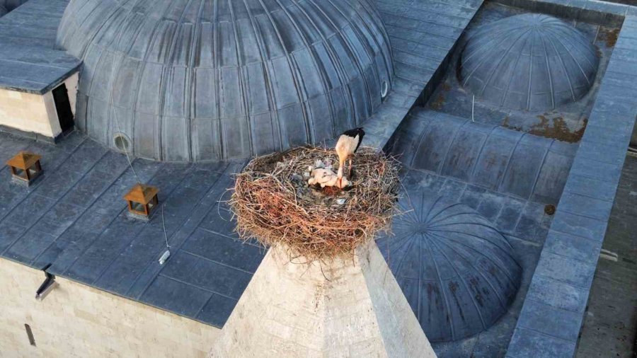 Karaman'da tarihi kümbeti mesken tutan leylek ailesi dronla havadan görüntülendi.