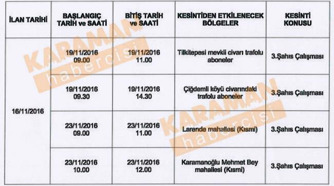 “Karaman Medaş İşletmesi sorumluluk alanı içerisinde yer alan aşağıda belirtilen bölgelerde yapılacak çalışmalar nedeniyle programlı elektrik kesintisi yapılacaktır. Çalışmaların programlanan süreden erken tamamlanması halinde bitiş saatinden önce elektrik verilebilecektir.” denildi.