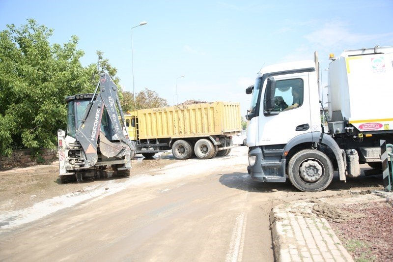 Melikgazi Belediyesi ilçede dün akşam saatlerinde etkili olan sağanak yağış sonrası yollarda oluşan hasarları onarırken, bir yandan da çamur olan noktaları yıkayıp temizliyor.