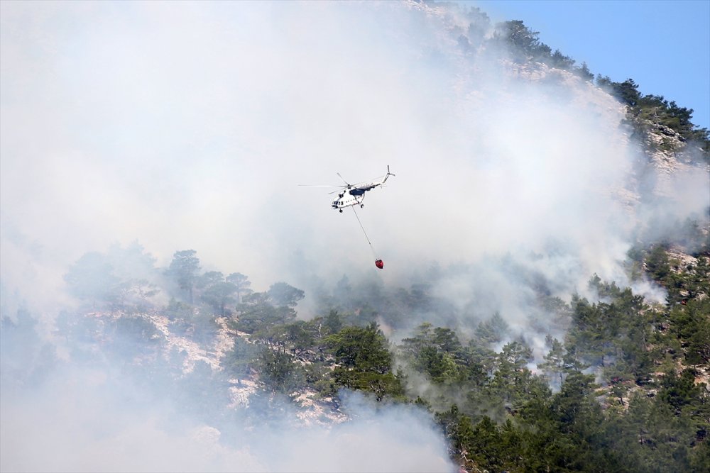 Havanın aydınlanmasıyla yeniden çalışmalara katılan söndürme helikopterleri de göletlerden taşıdığı suları aralıksız olarak yanan bölgelere atıyor.