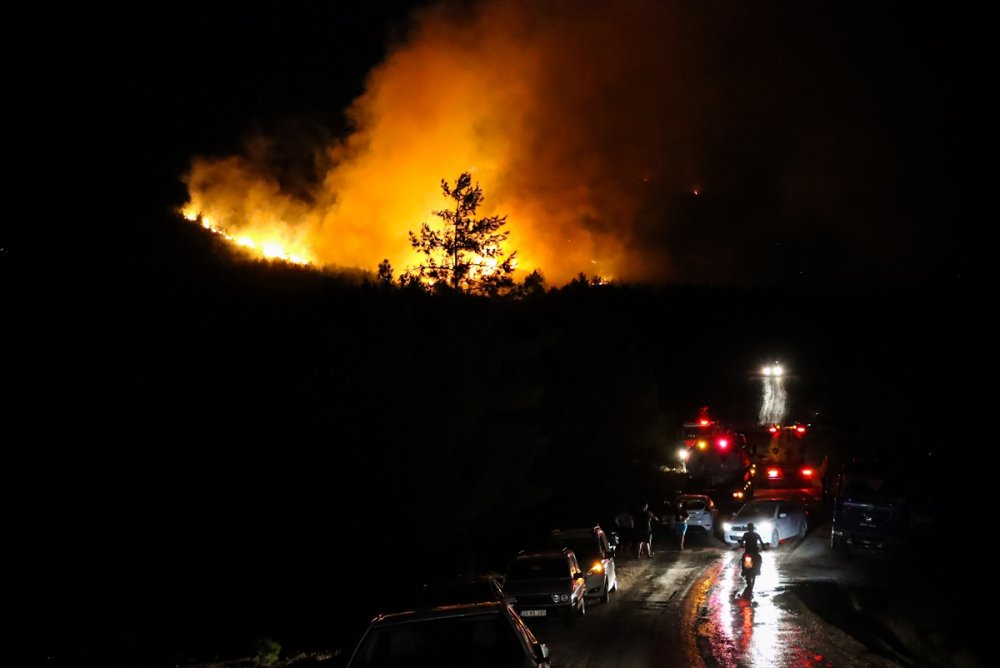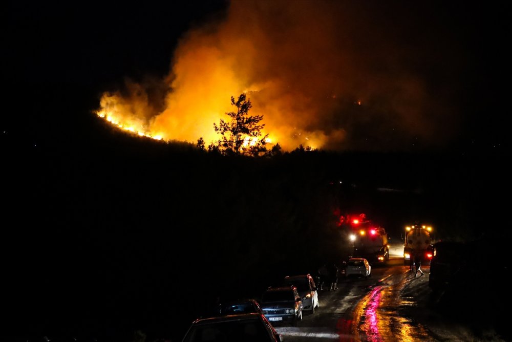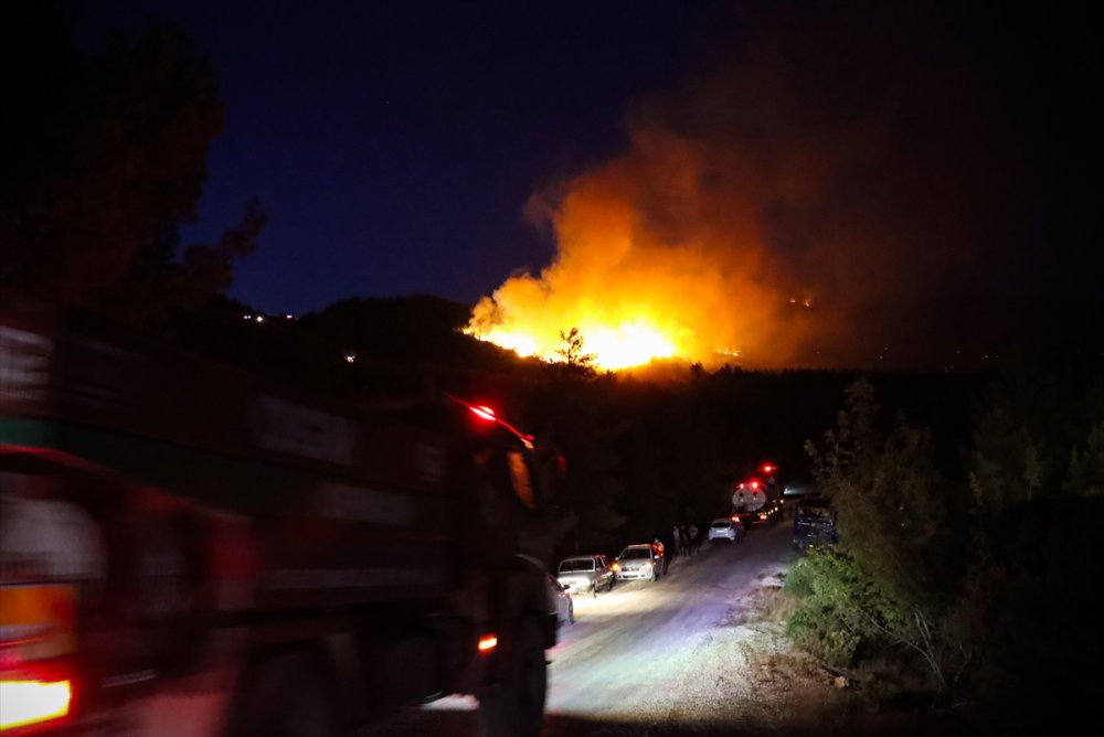 Yangını kontrol altına alma çalışmalarına katılan söndürme helikopterleri, havanın kararması nedeniyle müdahaleye araya verdi.