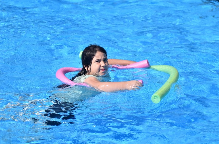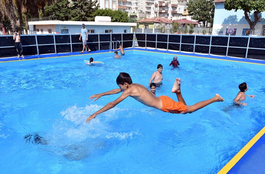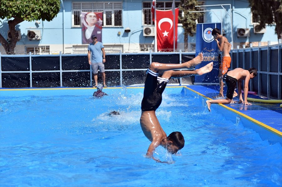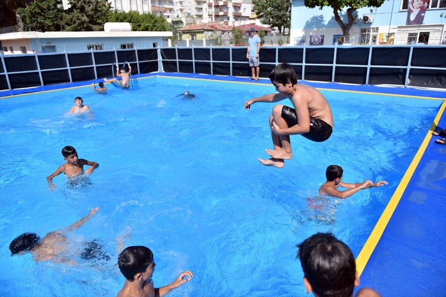 Akdeniz Belediyesinin, okul bahçelerine portatif havuzlar koyarak hayata geçirdiği yüzme eğitimlerine katılan çocuklar, gönüllerince eğlenip tatilin tadını çıkarıyor