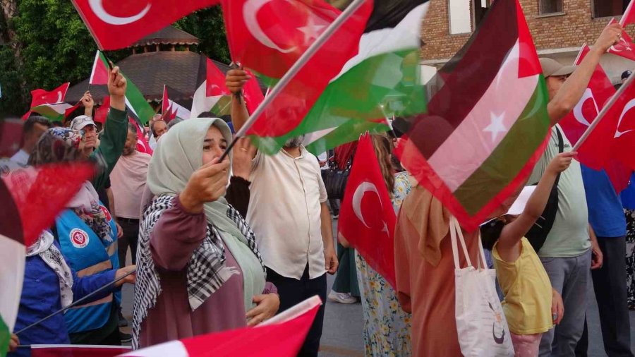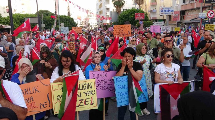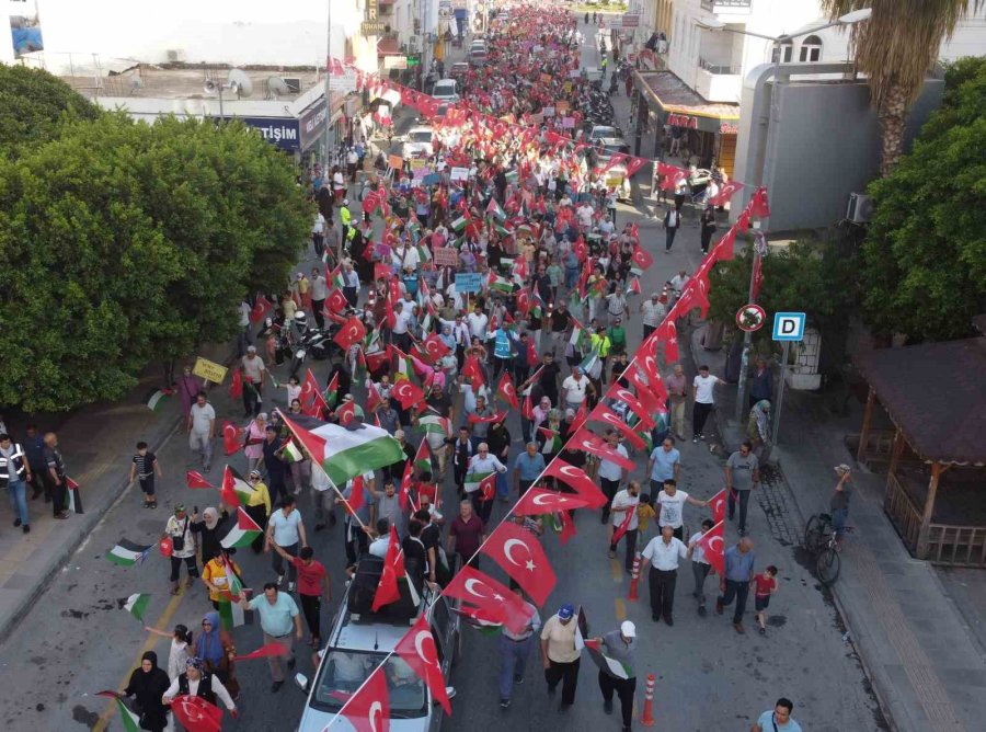 Mersin'in Erdemli ilçesinde toplanan vatandaşlar, Filistin'e destek, İsrail'e tepki yürüyüşü gerçekleştirdi.