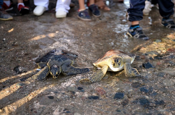 Mersin'deki Deniz Kaplumbağaları Kurtarma Rehabilitasyon ve Bilgilendirme Merkezinde tedavileri tamamlan 3 caretta caretta cinsi kaplumbağa denizle buluştu.