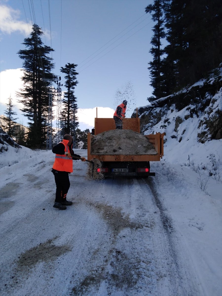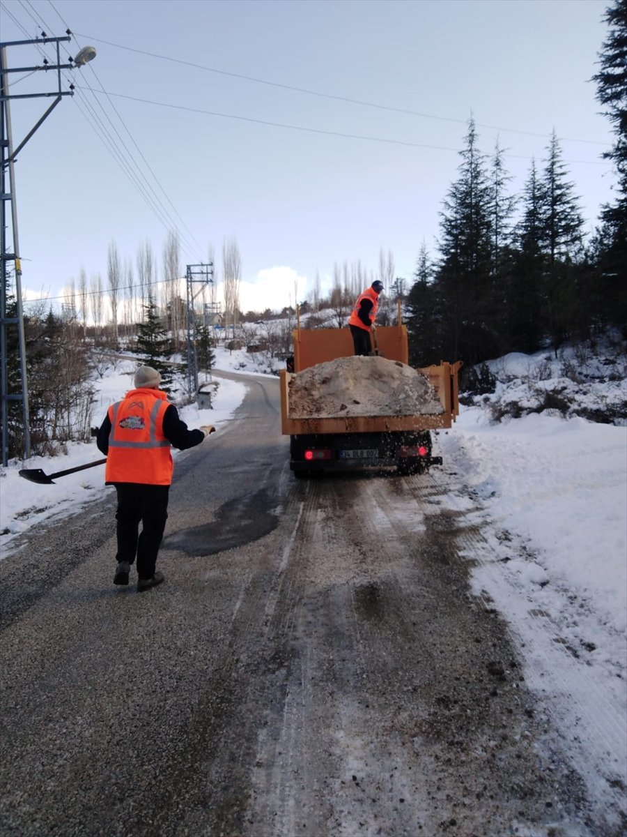 Bölgelere ulaşan ekipler, greyder yardımıyla buzlanma olan yollarda tuzlama çalışması yaptı.