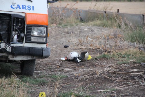 Polis, kaza yerinde incelemelerde bulunurken, motosiklet sürücüsünün kafasındaki kaskın kazada parçalanması ise dikkatlerden kaçmadı.