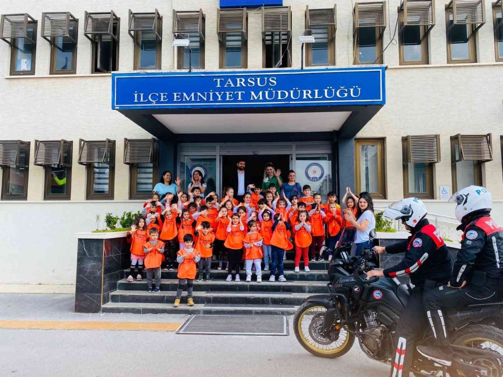 Mersin'in Tarsus ilçesinde minik öğrenciler, emniyet müdürlüğünü ziyaret etti, polis amcalarının haftasını kutladı.