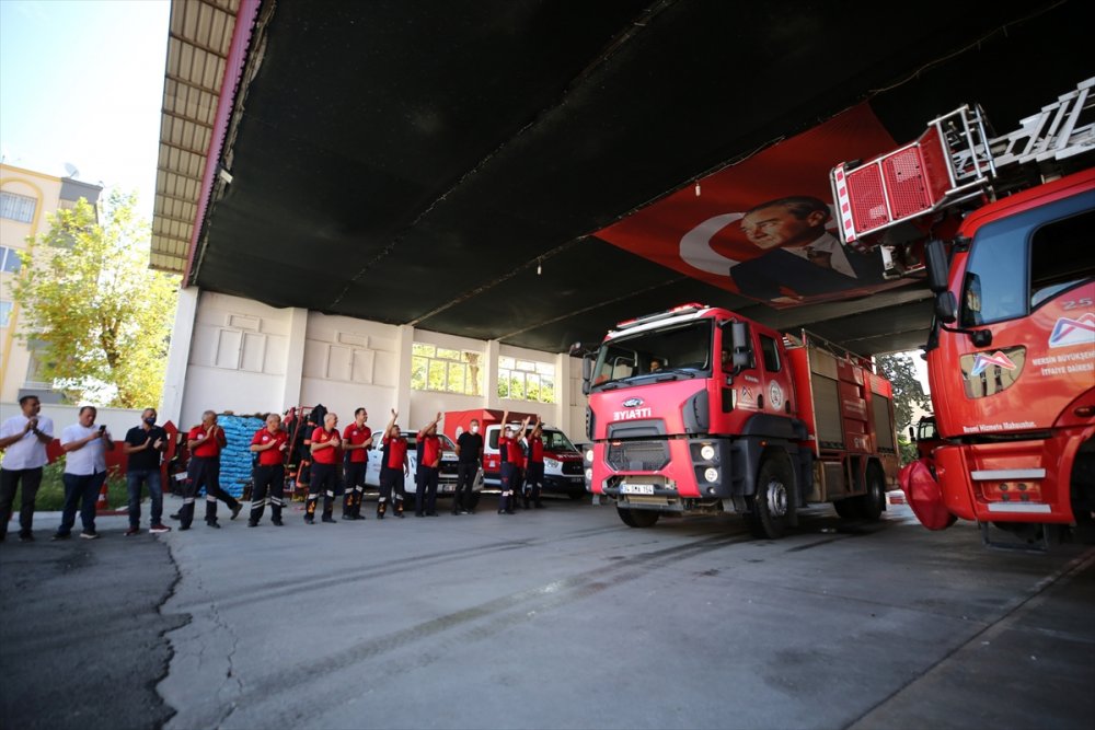 Muğla'daki orman yangınını söndürme mücadelesine destek veren itfaiye ekipleri, Mersin'deki görev yerlerine mesai arkadaşları ve vatandaşların alkışları arasında döndü.