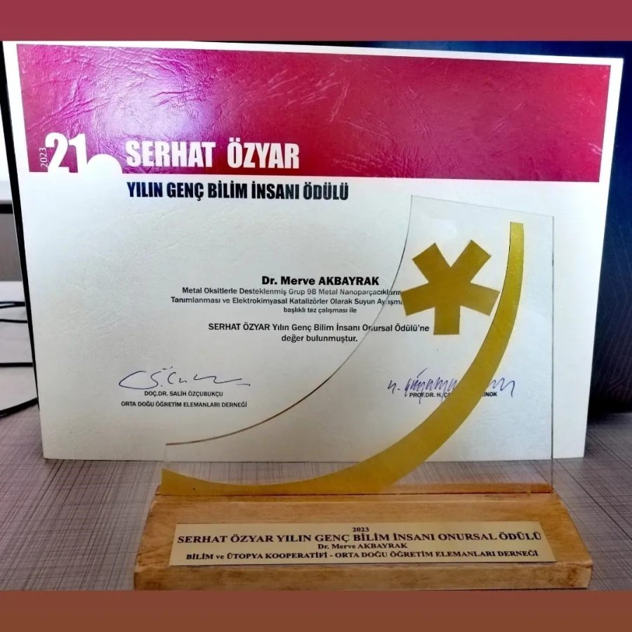 Prof. Dr. Ahmet M. Önal danışmanlığında yürütülen "Metal Oksitlerle Desteklenmiş Grup 9B Metal Nanoparçacıklarının Tanımlanması ve Elektrokimyasal Katalizörler Olarak Suyun Ayrışması" başlıklı tez çalışması ile Necmettin Erbakan Üniversitesi Fen Fakültesi Biyoteknoloji Bölümü Öğretim Üyesi Dr. Merve Akbayrak, "Serhat Özyar Yılın Genç Bilim İnsanı Onursal Ödülü"nü kazandı. Öğretim Üyesi Dr. Merve Akbayrak'ın, Serhat Özyar Yılın Genç Bilim İnsanı Ödülü 2023 yılı Seçici Kurulu tarafından ödülü kazanma gerekçesi; Dr. Merve Akbayrak'a ait "Preparation and Characterization of Metal Oxide Supported Group 9B Metal Nanoparticles and Their Use as Electrocatalysts in Water Splitting" başlıklı tez çalışmasında metal oksitlerle (titanya, zirkonya ve serya) desteklenmiş grup 9B metal nanoparçacıklarını (Co, Rh, Ir) sentezlemiş ve bu parçacıkların suyun elektrokimyasal ayrışmasında katalizör olarak etkinliklerini incelemiştir.