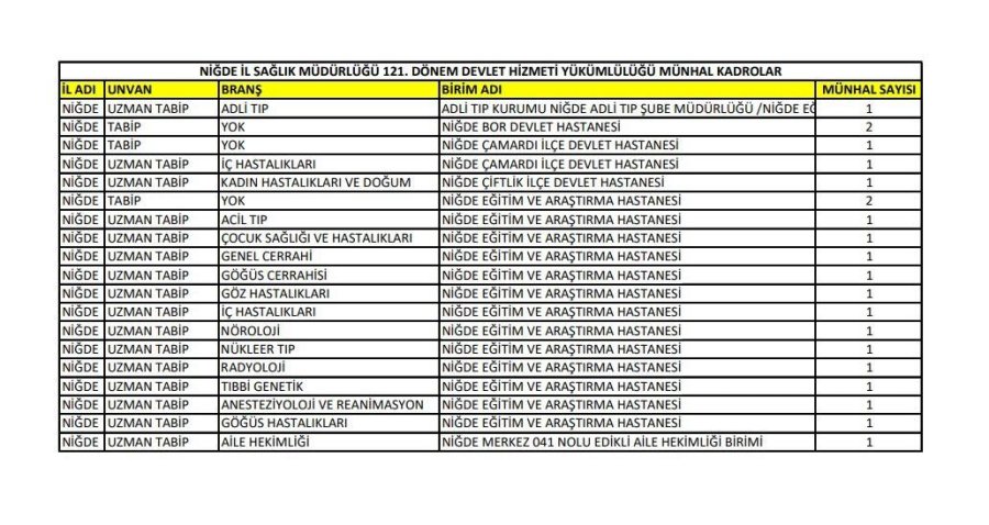 Atamalar kapsamında Niğde Adli Tıp Kurumu'na bir Adli Tıp Uzmanı, Bor Devlet Hastanesi'ne iki tabip görevlendirildi. Çamardı İlçe Devlet Hastanesi'ne bir İç Hastalıkları Uzmanı ve bir tabip atanırken, Çiftlik İlçe Devlet Hastanesi'nde bir Kadın Hastalıkları ve Doğum Uzmanı göreve başlayacak.