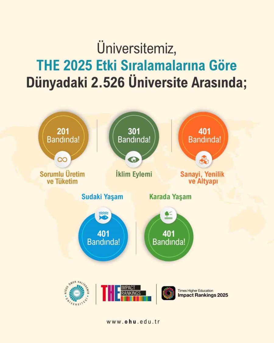 Aynı sıralamanın 2024 verilerine göre çok daha yukarılarda yer bularak istikrarlı yükselişini sürdüren Niğde Ömer Halisdemir Üniversitesi; böylece sürdürülebilirlik konusundaki kararlılığını ve küresel ölçekteki başarısını bir kez daha tescilledi. BM Sürdürülebilir Kalkınma Hedefleri (SKH) kapsamında yapılan değerlendirmede, bu yıl 130 ülkeden toplam 2 bin 526 üniversite sıralamaya girdi. Bu sıralamaya göre Niğde Ömer Halisdemir Üniversitesi, Sorumlu Üretim ve Tüketimde 201 bandında, İklim Eyleminde ise 301 bandında yer aldı. Üniversite ayrıca Sanayi, Yenilik ve Altyapı, Sudaki Yaşam ve Karada Yaşam sürdürülebilir hedeflerinde ise 401 bandında yer alarak önemli dünya ölçeğinde önemli bir başarıya imza attı. Niğde Ömer Halisdemir Üniversitesi sıralamaya girebilen Türk üniversiteleri arasında ise beş ayrı kategoride adını ilk 40 yükseköğretim kurumu arasına yazdırdı. Buna göre NÖHÜ; İklim Eyleminde 12, Sorumlu Üretim ve Tüketimde 14'üncü olarak çok önemli başarı elde etti. Yine Niğde Ömer Halisdemir Üniversitesi, Türk üniversiteleri arasında Sudaki Yaşam ile Karada Yaşam hedeflerinde 30'uncu olurken, Sanayi, Yenilik ve Altyapıda 37'nci sırada yer aldı.
