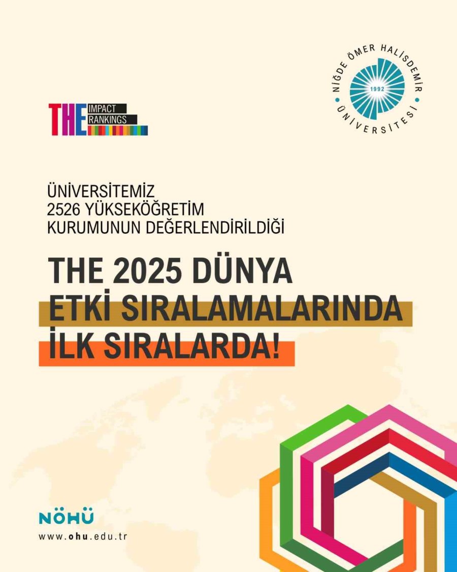 Niğde Ömer Halisdemir Üniversitesi dünyanın en prestijli yükseköğretim derecelendirme kuruluşlarından biri olan Times Higher Education (THE) tarafından açıklanan Birleşmiş Milletler Sürdürülebilir Kalkınma Hedeflerine ilişkin 2025 Etki Sıralamalarında (Impact Rankings) beş ayrı kategoride dünyada ve Türkiye'de ilk sıralarda yer aldı.