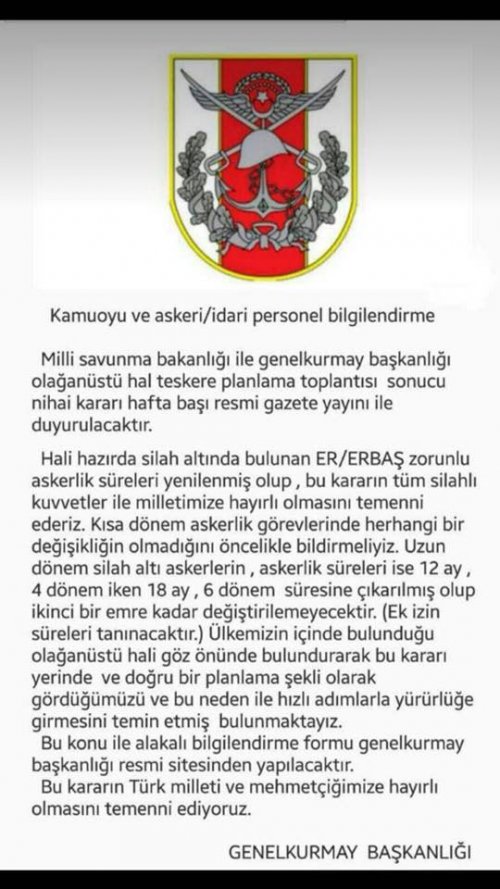 Bugün farklı haber kaynaklarından 12 ay olan uzun dönem askerlik süresinin eski haline yani 18 aya uzatıldığı yönünde haberler yayınlandı.