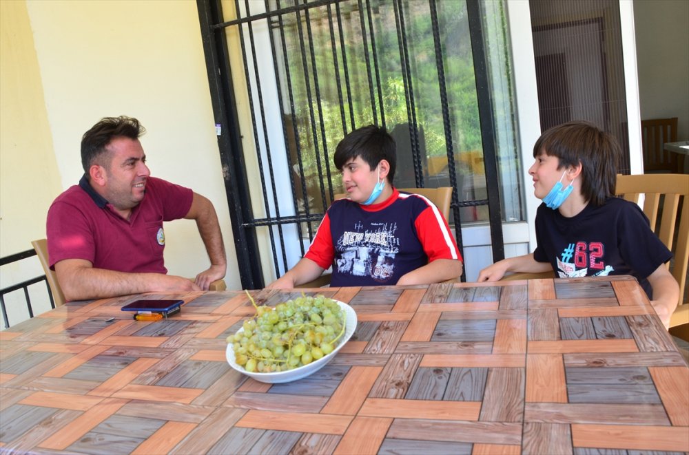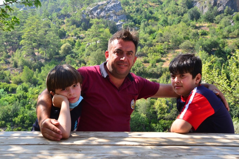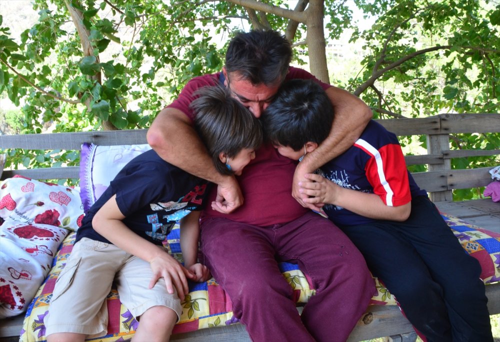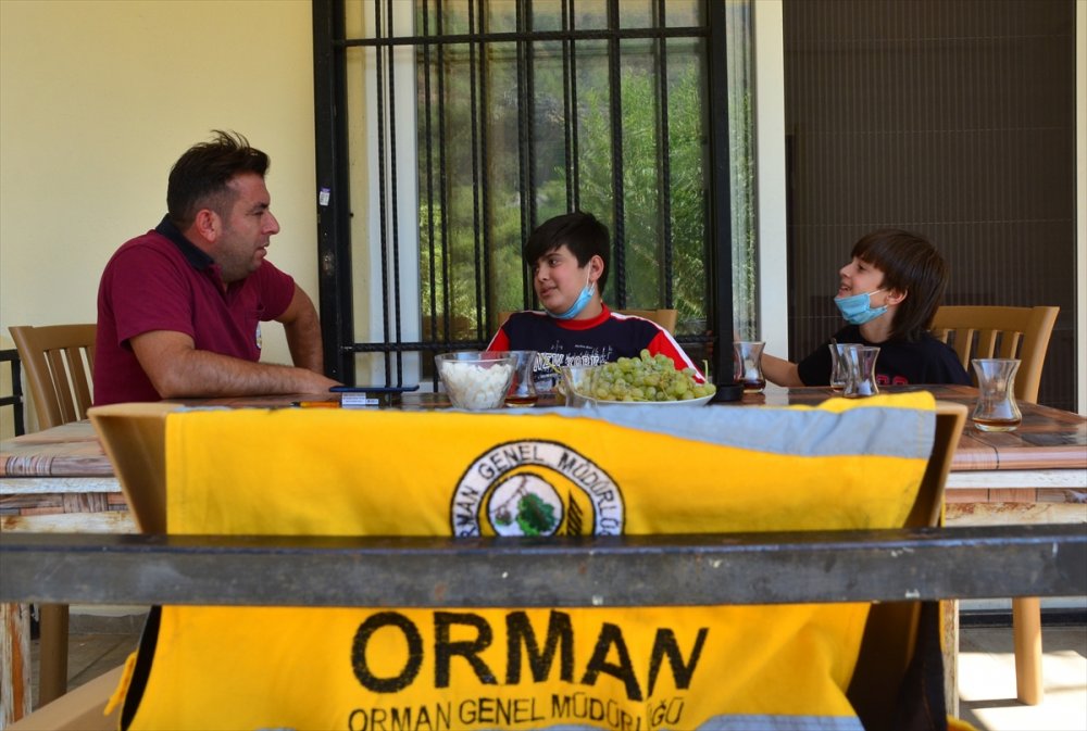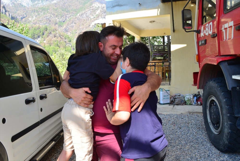 Antalya'nın Manavgat ilçesindeki orman yangınında arazöz üzerinde oğluyla yaptığı telefon görüşmesiyle hatırlanan orman işçisi Süleyman Harun Akıncı, çocuklarına kavuşmanın mutluluğunu yaşıyor.