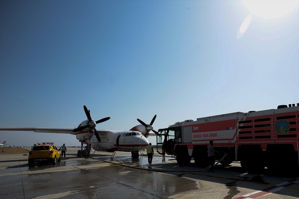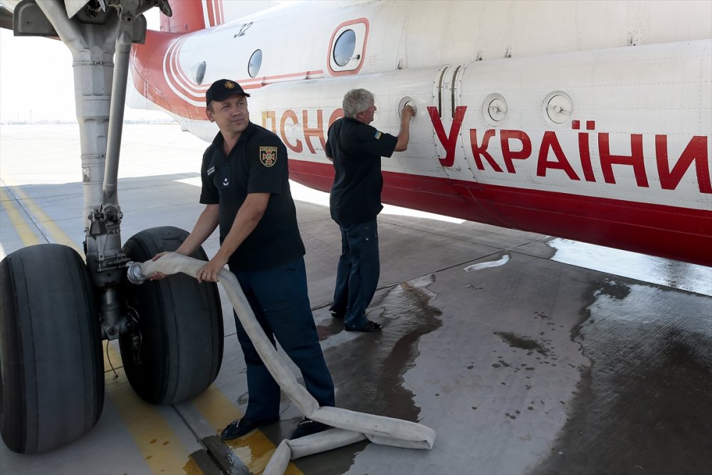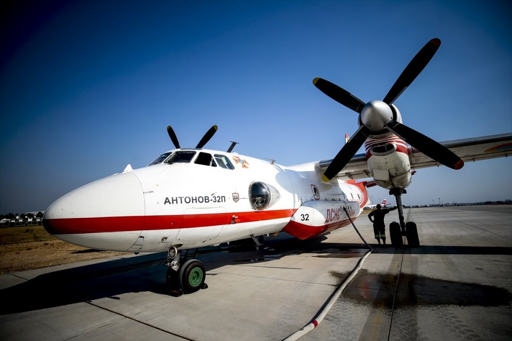 Antalya'daki orman yangınlarının kontrol altına alınması amacıyla yürütülen çalışmalara havadan destek veren Ukrayna'dan gelen AN-32 P tipi yangın söndürme uçağı ekibi gün boyunca müdahalesine sürdürüyor.