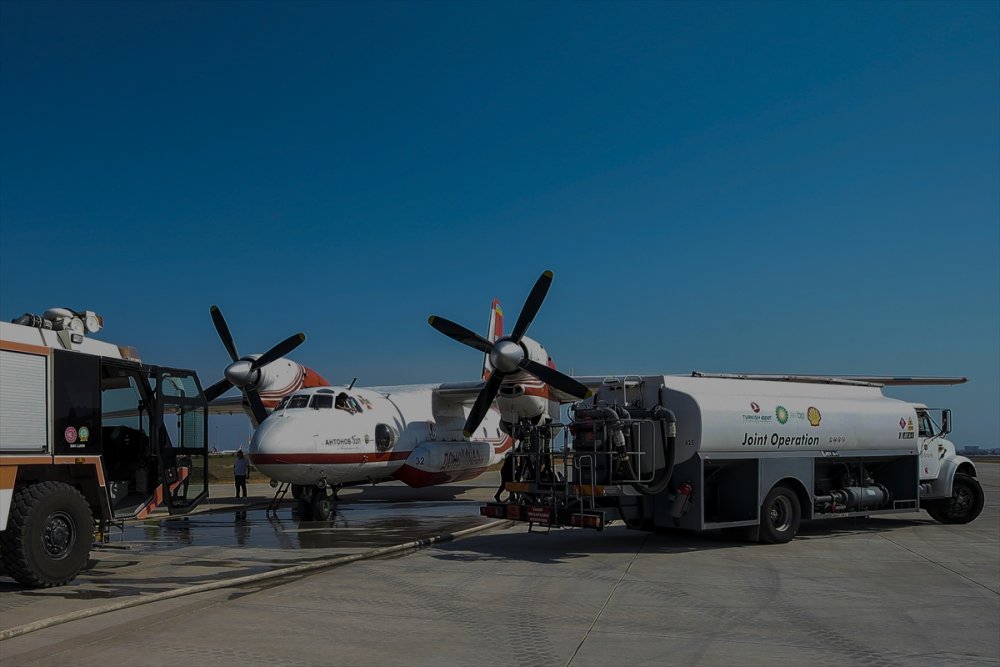 Antalya Havalimanı'nda su ve yakıt ikmali yapan ekipler, yangın koordinasyon merkezinden gelen koordinatlar üzerine harekete geçiyor.