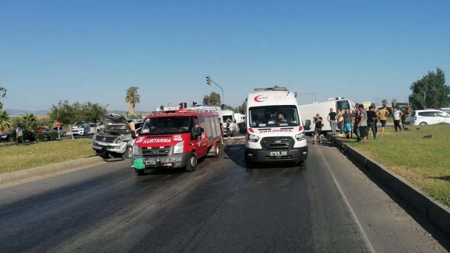 Antalya'nın Manavgat ilçesinde otel çalışanlarını taşıyan servis midibüsü ile kamyonetin çarpıştığı kazada 8 kişi yaralandı. Can pazarının yaşandığı kazada araçta sıkışan kamyonet sürücüsü itfaiyesi ekiplerince araçtan çıkarıldı.