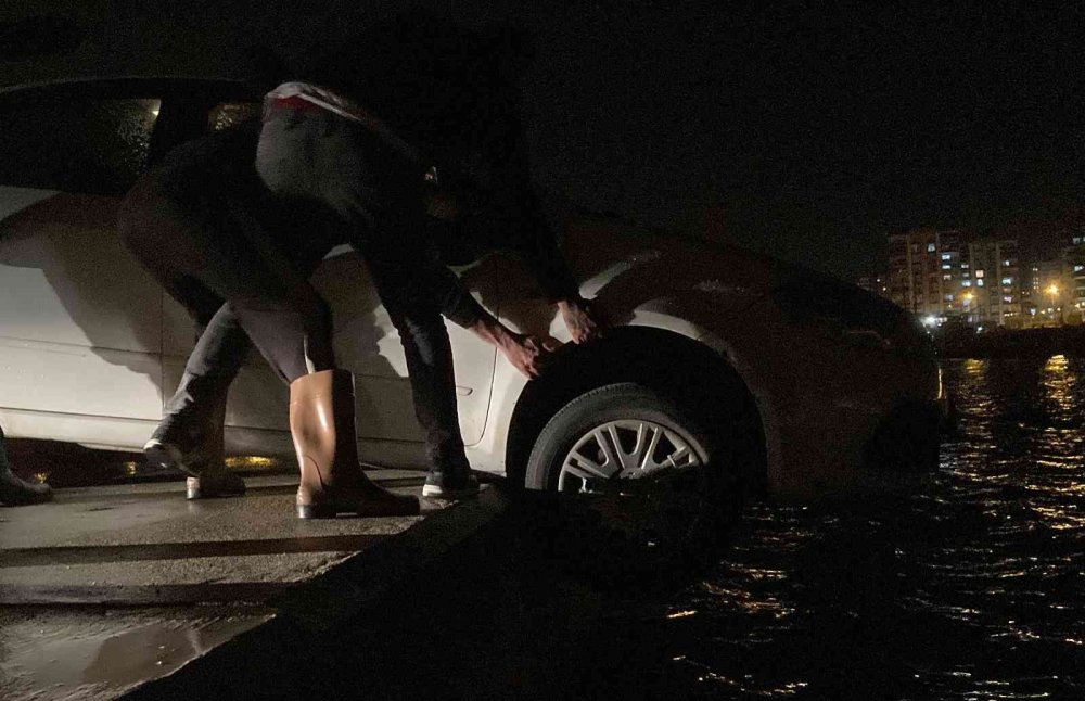 Mersin'de aşırı yağmur sırasında açık kapıdan balıkçı barınağına giren sürücü, yolun bittiğini son anda fark etti.