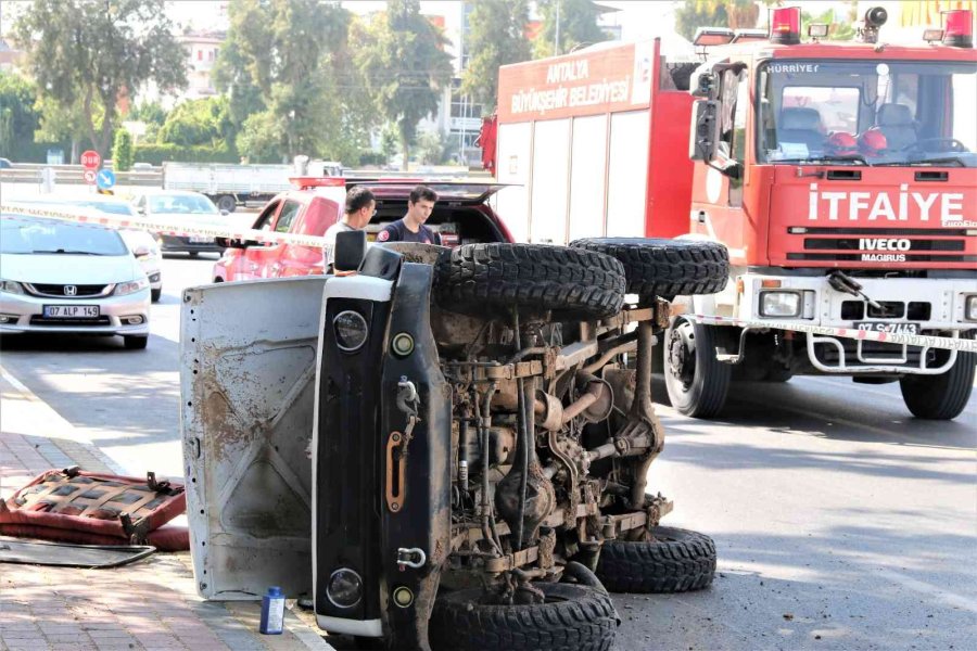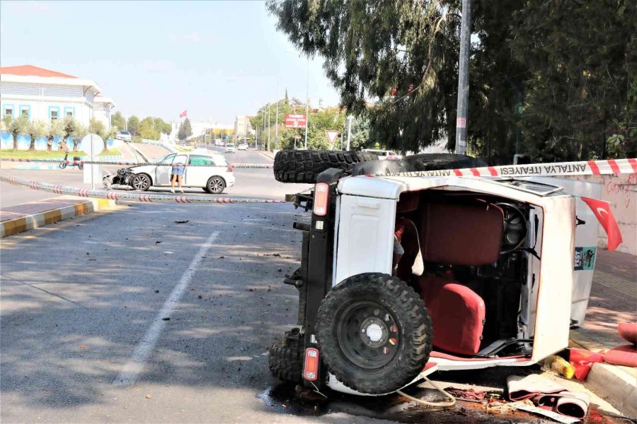 Antalya'da arazi cipi ile otomobilin çarpışması sonucu meydana gelen kazada yan yatan cipin içerisinde bulunan 2 kişi yaralandı. Kazayı yara almadan atlatan Ukraynalı kadın sürücü ise uzun sure kazanın şokundan çıkamayarak, olay yerine gelen arkadaşının aracının içerisinde sakinleşmeye çalıştı.