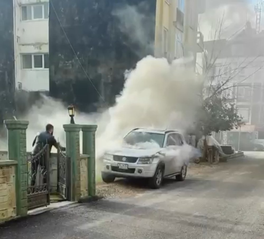 Otomobildeki Yangına Çeşme Hortumuyla Müdahale