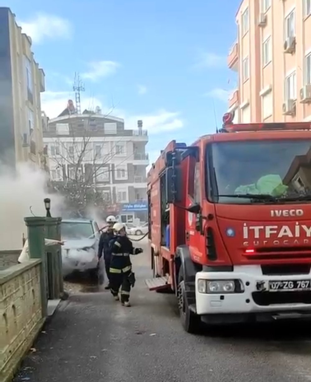 Antalya'da park halinde motor bölümünden yanmaya başlayan otomobil itfaiye ekiplerinin müdahalesiyle söndürüldü. Bir kişinin yanan araca hortumla su tutmaya çalıştığı görüldü.