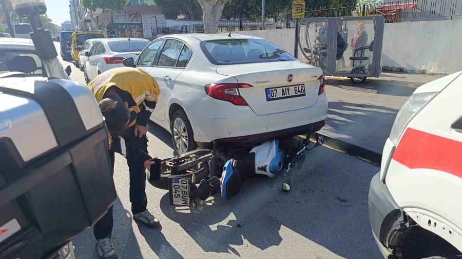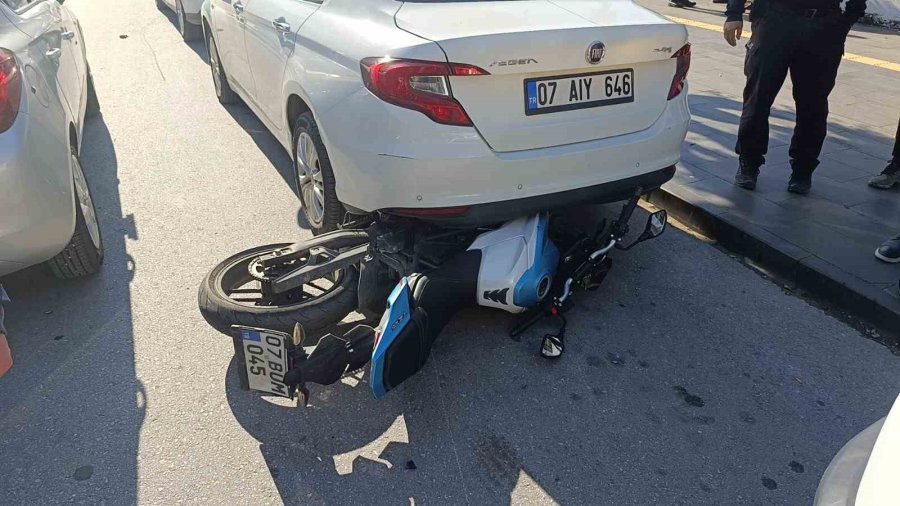 Antalya'nın Manavgat ilçesinde seyir halindeki otomobili geçmek isterken aynasına çarpan motosiklet, yol kenarında park halindeki otomobilin altına girdi.