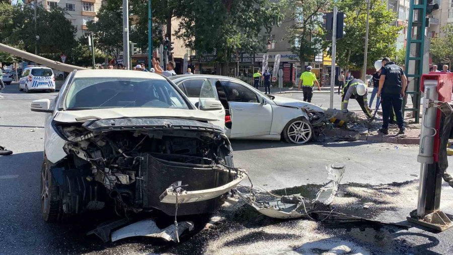 Konya'da 2 otomobilin çarpıştığı trafik kazasında otomobillerden biri aydınlatma direğine çarptı.