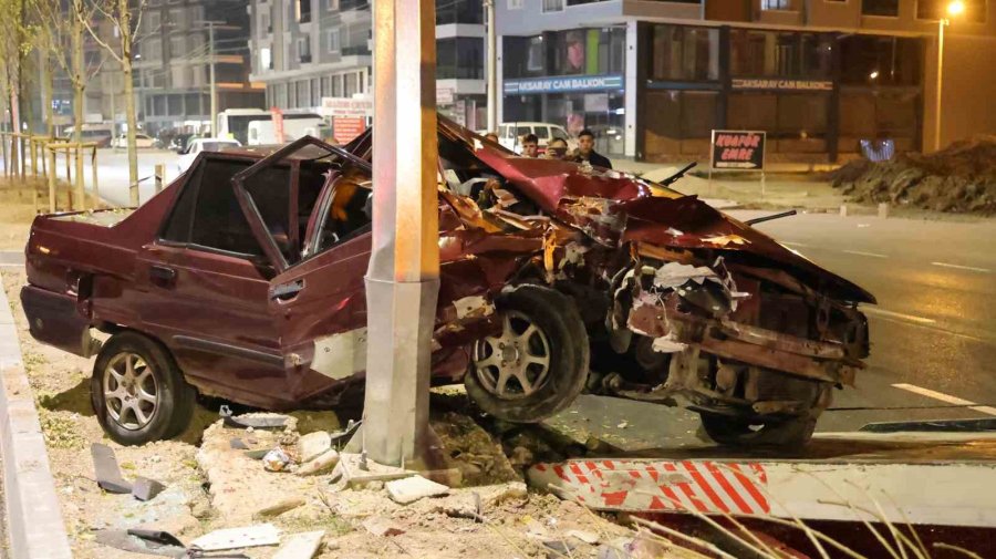 Aksaray'da 2 otomobilin çarpıştığı kazada kontrolden çıkan otomobil aydınlatma direğine çarparak durabilirken adeta hurdaya dönen otomobilde bulunan...