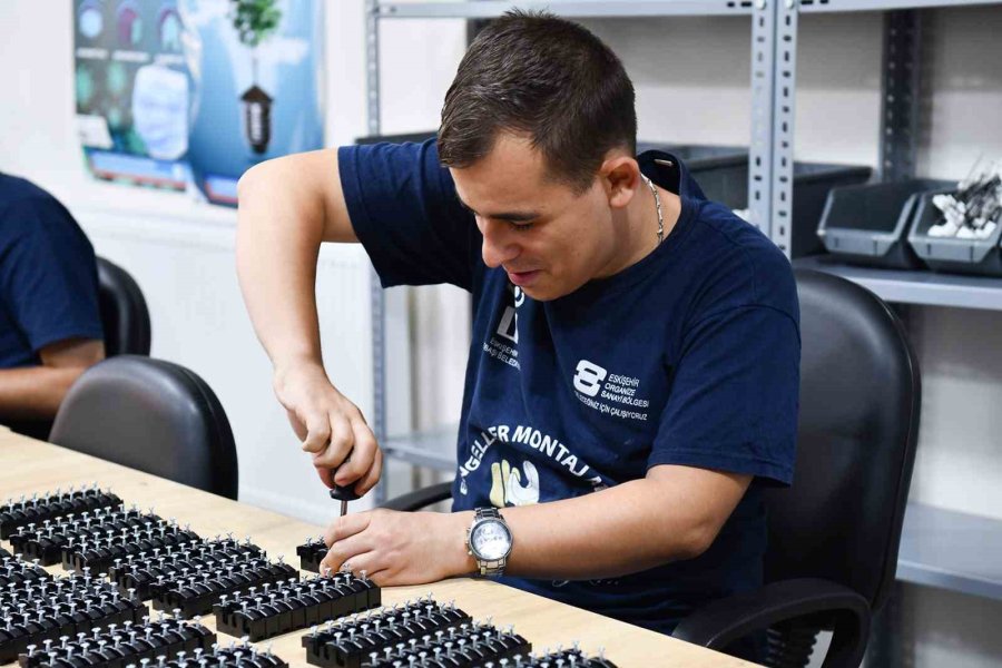 Tepebaşı Belediyesi'nin Engelliler Montaj Atölyelerinde eğitim gören bireyler, üretmeyi öğrenerek iş gücüne katılırken başarmanın da mutluluğunu yaşıyor.