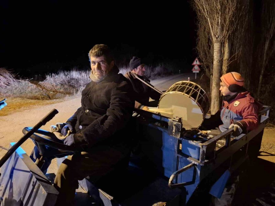 Konya'nın Bozkır ilçesine bağlı Sazlı Mahallesinde, Ramazan ayının vazgeçilmez geleneği olan davulla sahura uyandırma geleneği, bu yıl farklı bir şekilde hayata geçiriliyor. Tarımla uğraşan mahalle sakinleri, sahur vaktinde köy halkını uyandırmak için geleneksel davulun yanı sıra "patpat" adı verilen tarım aracını kullanıyor. Renkli uygulama köy sakinleri tarafından memnuniyetle karşılanırken, mahallede yaşayan Mustafa Uysal ve Abdullah Köse, Ramazan davulculuğu geleneğini patpat aracıyla birleştirerek köydeki herkesi sahura kaldırıyor. Mustafa Uysal'ın kullandığı patpat aracının sesi, Abdullah Köse'nin davul sesiyle birleşirken, sahura kalkamayan kimse kalmıyor.