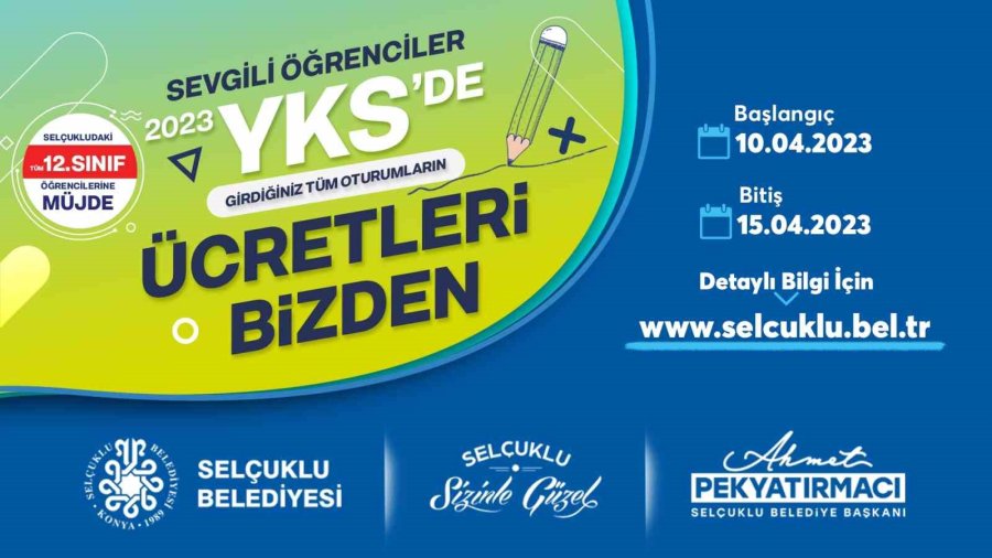 Tüm faaliyetlerinde geleceğin teminatı olan gençlere öncelik veren Selçuklu Belediyesinden öğrencileri sevindirecek bir müjde daha geldi. Müjdeyi sosyal medya hesabından duyuran Selçuklu Belediye Başkanı Ahmet Pekyatırmacı, bu yıl Yükseköğretim Kurumları Sınavı'na girecek olan 12. sınıf öğrencilerinin tüm ücretlerinin belediye tarafından karşılanacağını ifade etti. Selçuklu'da ikamet eden tüm 12. sınıf öğrencilerinin faydalanacağı YKS için başvurular 10 Nisan'da başladı. 15 Nisan'a kadar devam edecek başvuruların tüm detayları ise www.selcuklu.bel.tr adresinde yer alıyor.