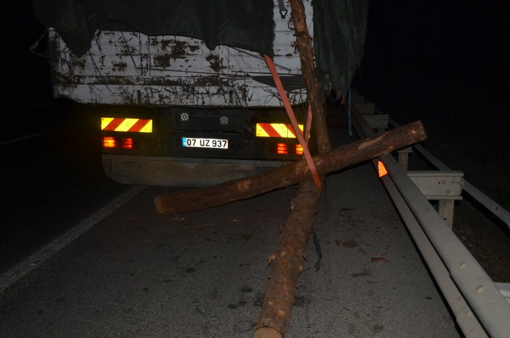 Manavgat'tan Antalya istikametine seyir halindeki Hüseyin Uysal'ın kullandığı 07 UZ 937 plakalı kamyonda yüklü tomruklardan bazıları Aspendos Kavşağı'na geldiği sırada yola düştü.