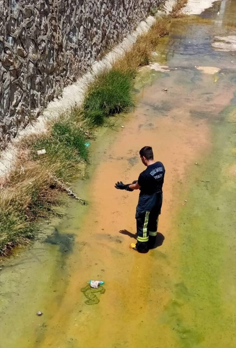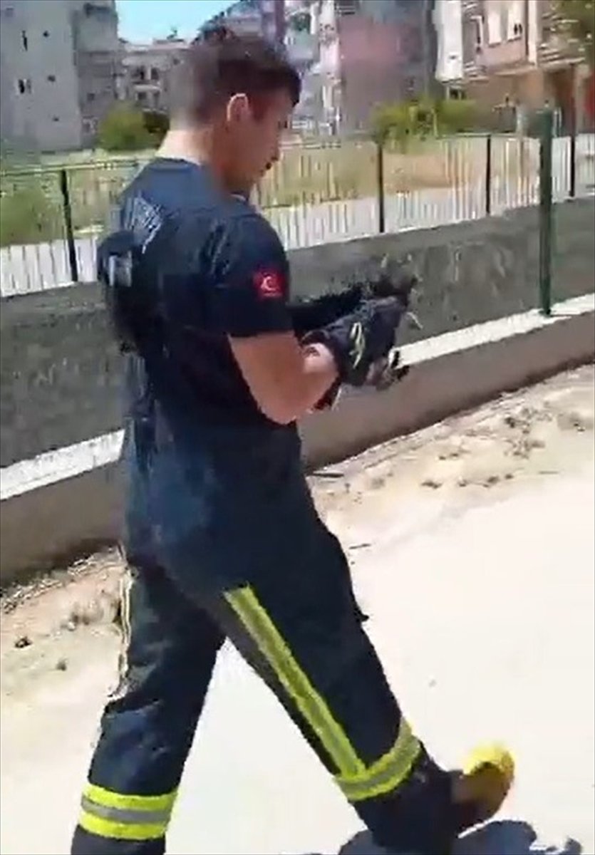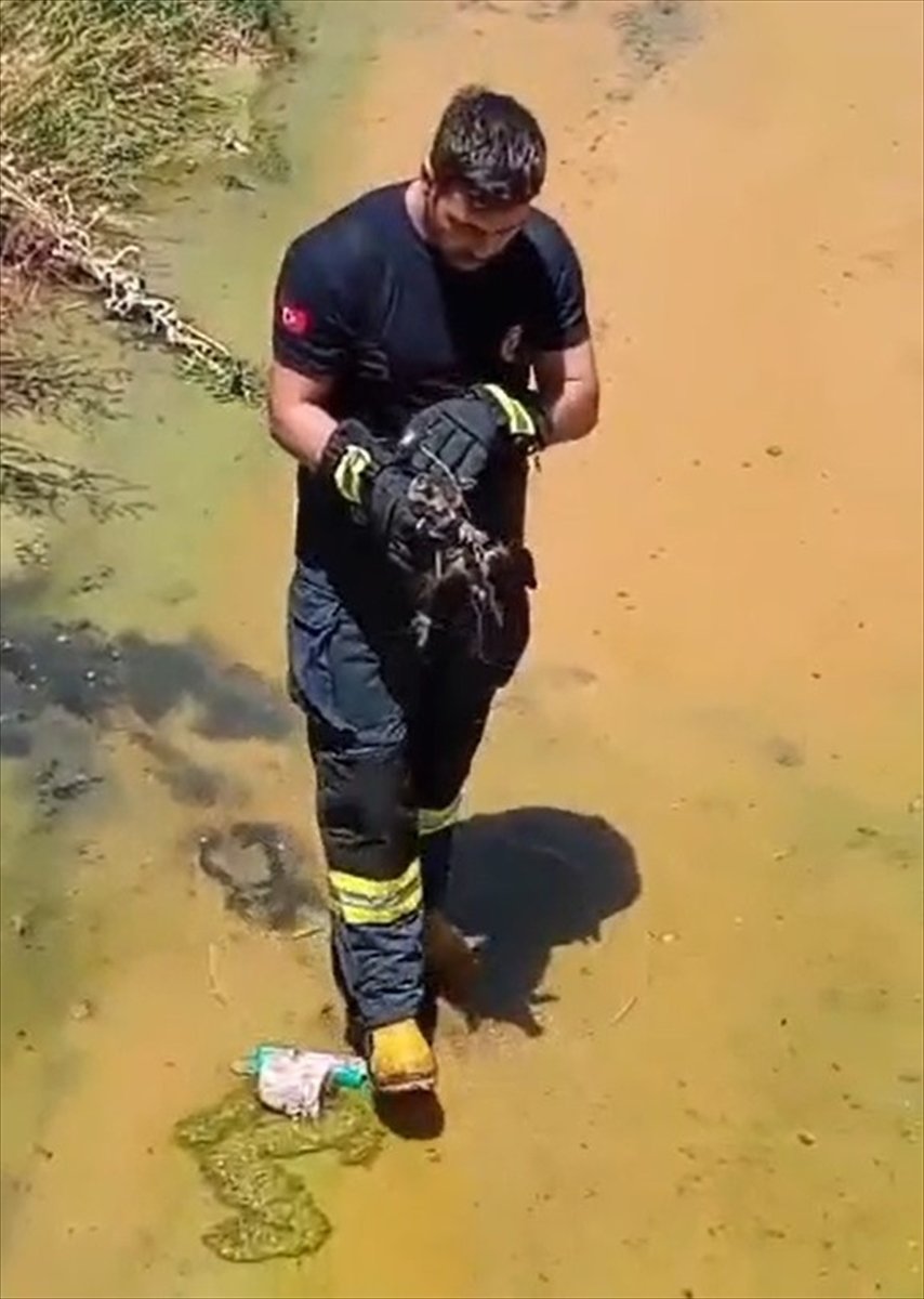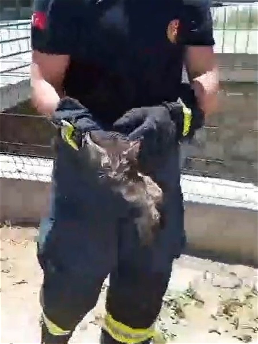 İtfaiye ekibi kanal içerisindeki ıslanmış kediyi eliyle alarak çıkardı.