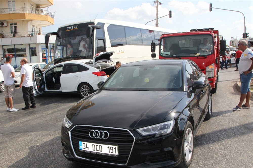 Antala'nın Serik ilçesinde tur otobüsü ile 2 otomobilin çarpışması sonucu araçlarda hasar oluştu, ulaşım bir süre aksadı.