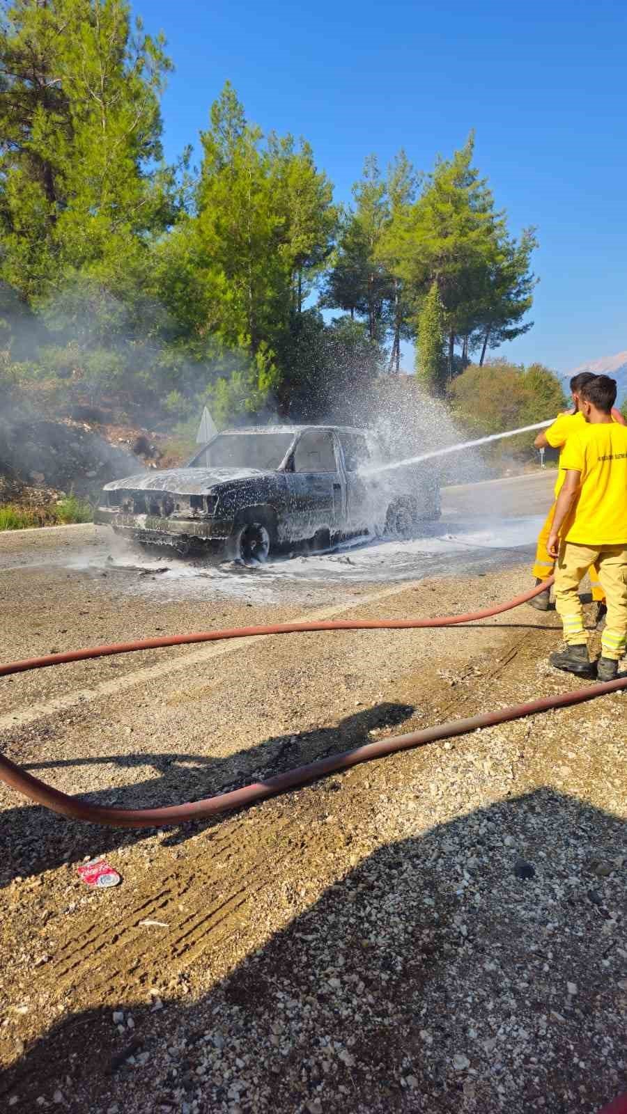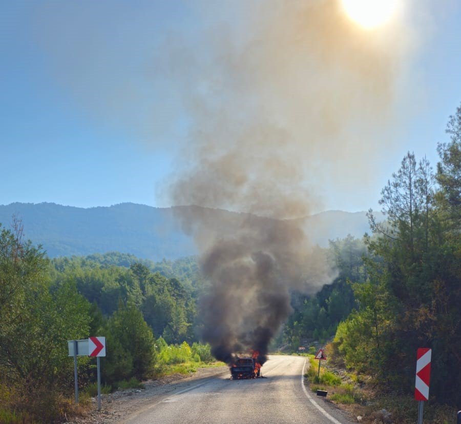 Bu sabah saat 10.00'da Kumluca ilçe merkezinden dağlık bölgede bulunan Kuzca, Büyükalan ve Gölcük Mahallelerine hizmet takibi için yola çıkan kamyonet tipi araç, Altınyaka Mahallesi yakını Güzle mevkisinde seyir halindeyken birden alev aldı. Araçta bulunan belediye personeli yangını söndüremeyince araçtan uzaklaştı. Aracın yandığını görenler durumu 112 Acil Çağrı Merkezine bildirdi. Yangına, Güzören Mahallesi Karaşar mevkisinde ve Altınyaka Mahallesi'nde konuşlanan Kumluca Orman İşletme Müdürlüğüne bağlı orman yangın ekipleri müdahale etti.