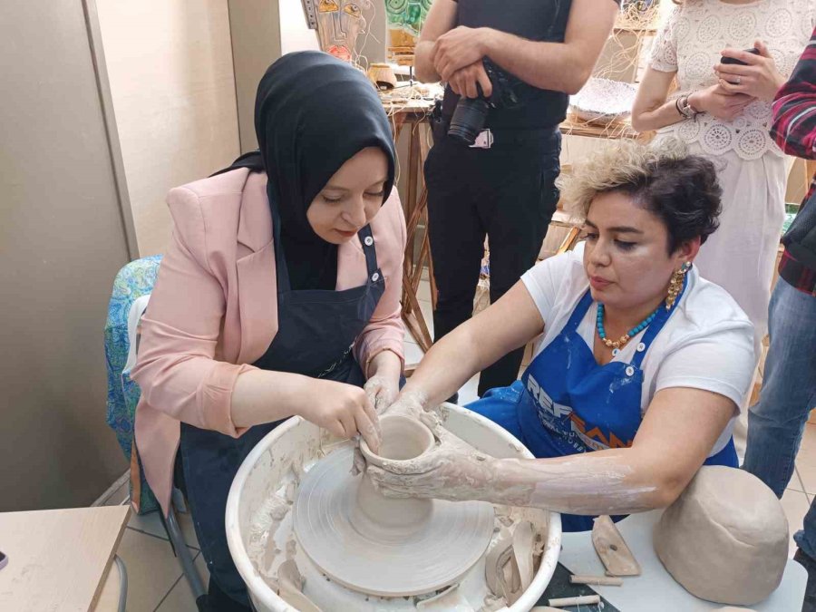Daha sonra tezgâh başına geçerek hazırlanan çamurdan vazo yapan Kaymakam Altın katılanlardan tam not aldı.