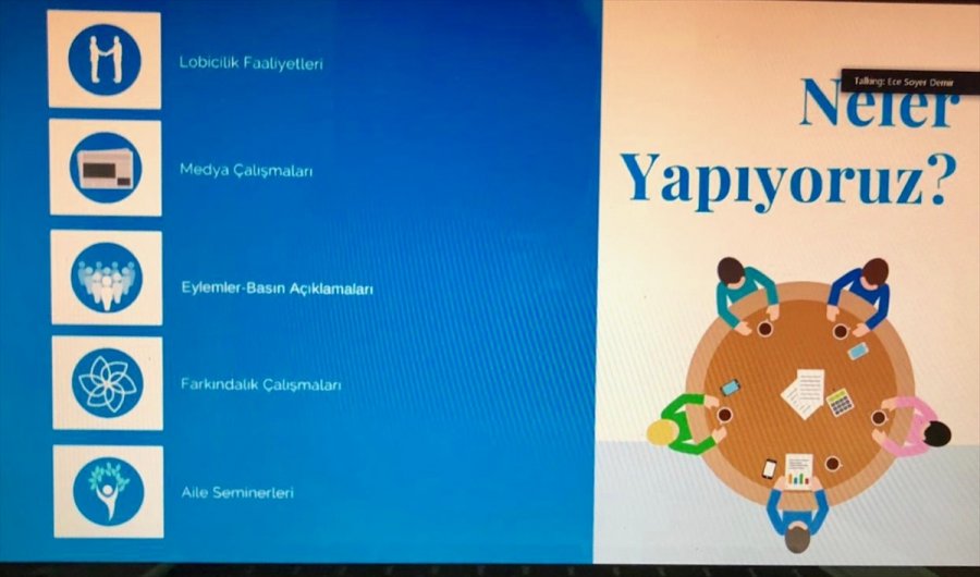 Zoom uygulaması üzerinden yapılan toplantıda konuşan SMA-DER Başkan Yardımcısı Ece Soyer Demir, Engelliler Konfederasyonunun "Aktif Yurttaşlık Hakkımızdır: Türkiye Engelliler Meclisine Doğru" projesi tarafından Engelli Örgütlerinin Savunuculuk Kapasitesi ve Karar Süreçlerine Katılımlarının Güçlendirilmesi Alt Hibe Desteği'ne yaptıkları başvurunun kabul edilmesiyle AB tarafından desteklenen projenin çalışmalarına başladıklarını bildirdi.