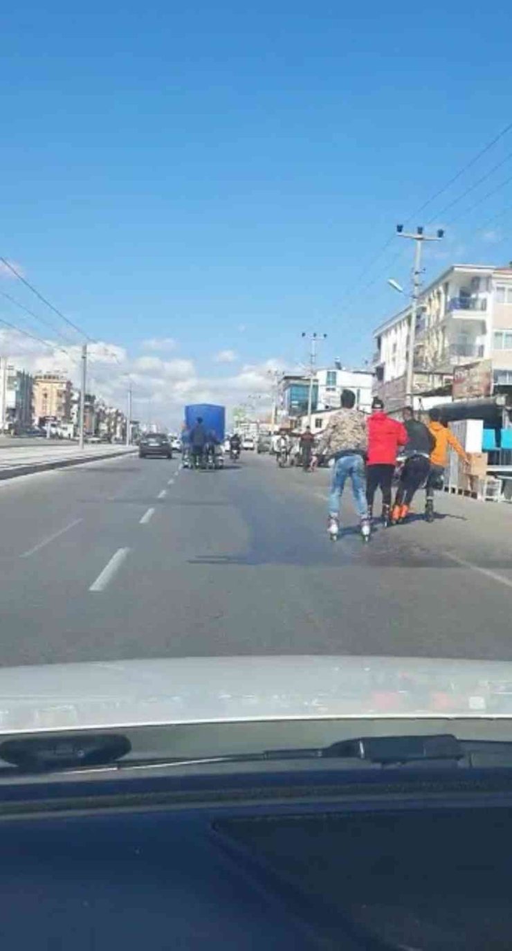 Bir farklı görüntüde ise bir grup genç, yine halk otobüsünün arkasında patenle tehlikeli yolculuk yaparken, bir sürücü o anları kayıt almaya başladı. Otobüsü bırakıp yolculuklarına devam eden gençlerden birisi dengesini kaybederek yere düştü. Bu sırada yanındaki diğer arkadaşları da dengelerini kaybetmemek için yolun ortasına doğru yöneldi. Bu sırada kayıttaki sürücü refleksle direksiyonu kırarak facianın önüne geçmiş oldu.